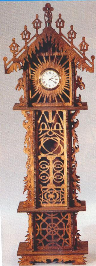 This clock is made of 1/8" thick oak. It stands about 18" tall and is beautifully detailed on 3 sides. The price for this clock is $150 plus $10 for shipping and handling. (also can made from Ash if desired. All other wood may have a slightly higher price. It can be finished in any stain or clear.) | ||
