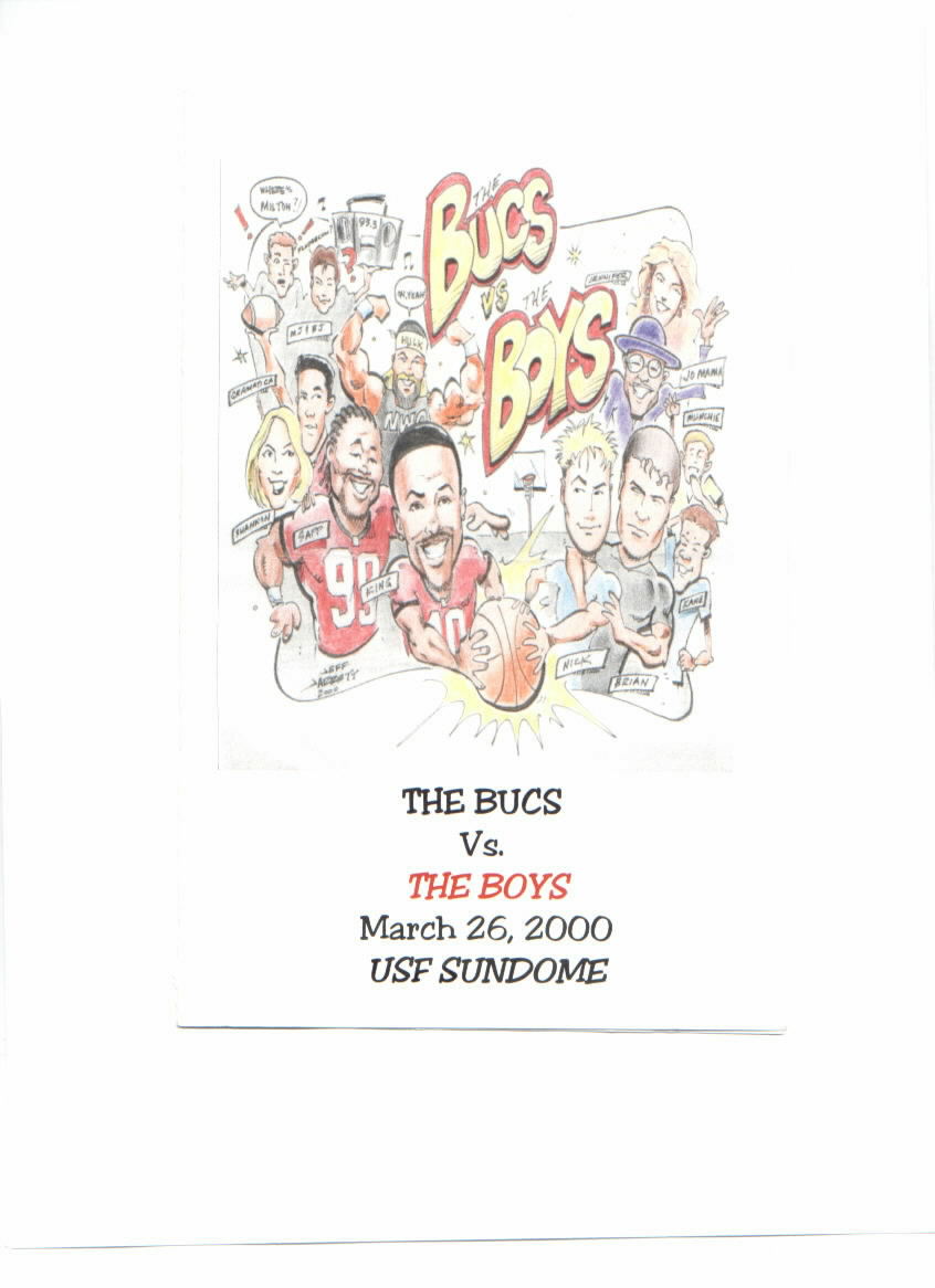When I was visiting Tampa, Florida I was lucky enough to snag tickets to the Bucs Vs. Boys Charity Basketball Game at the USF Sundome on March 26, 2000. What is it, you may ask? It was a basketball game that Nick Carter and Brian Littrell mixed with a team of a local radio station (93.3 WFLZ) DJs, WCW wrestlers, and a BSB producer faced a team of radio DJs and players of the Tampa Bay Buccaneers. All of the money earned was given to charity at St. Joseph's Hospital. It was an amazing game, the boys won 108-104. The game earned $80,000 to $90,000 for the charity. It was also the first time since 1984 that the USF Sundome sold out! I was lucky enough to have 12th row and get pics. I saw the guys perfectly, but my camera didn't exactly see what I saw, and I'm not a great photographer, but here are a few pics from it. If you want to see more pics(that are closer and more professional than mine) go to www.933flz.com. (Maximize the page to see it best.)