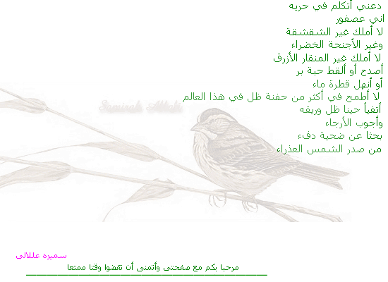 EDUCATION: High school(Rabat), senior year in Journalism at University of Florida....Expected to graduate in December 1999 or May 2000...I have applied for graduate studies at several universities...I am planing to study International law for my master degree SPORTS:Outstanding Volleyball player, Good swimmer , the worst you can imagine in other sports ( unless you consider pool and chess as sports ) HOBBIES:Reading, cooking, and traveling and I hate movies of all kinds!!! . I play volleyball, it is my best sport and I am real good at it. I write poetry also, please read some of my writings by clicking on the specified link. I don't claim that I am good but I try... I like Arabic poetry very much..My favorite is Ibrahim Naji and Badr Shaker Al-Sayyab, please see my selection of arabic poetry. I apologize if I did not select anything that matches your taste. MUSIC:I