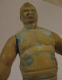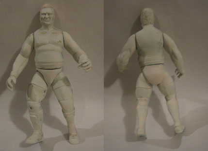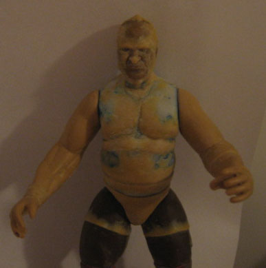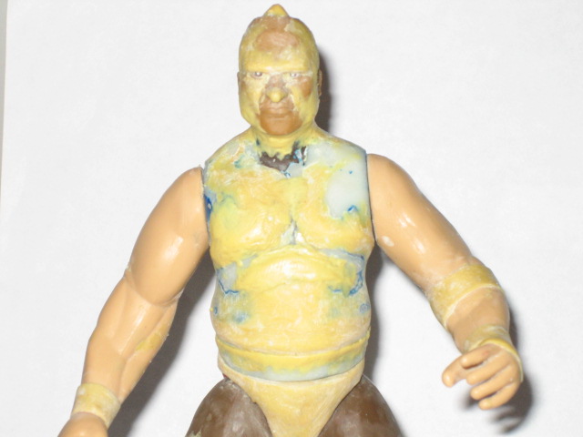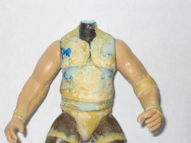 I decided to actually sculpt on the waistband of the shorts to sort of balance out the shape of the upper body. Obviously the head has been attached and the neck joint is being filled in with putty. Also doing some more work on the stomach, peck and added an abdomin flab.