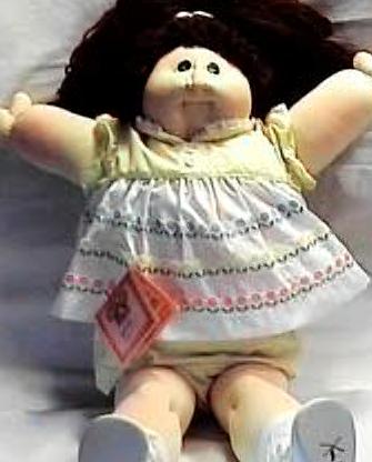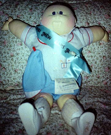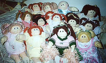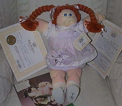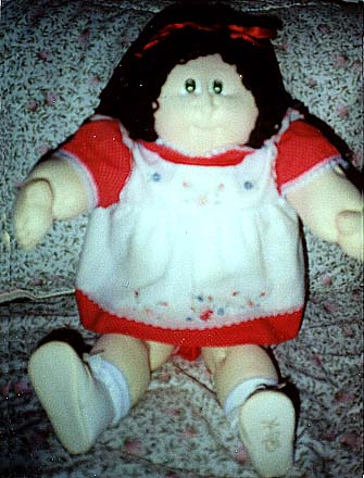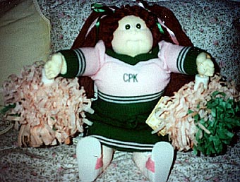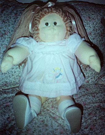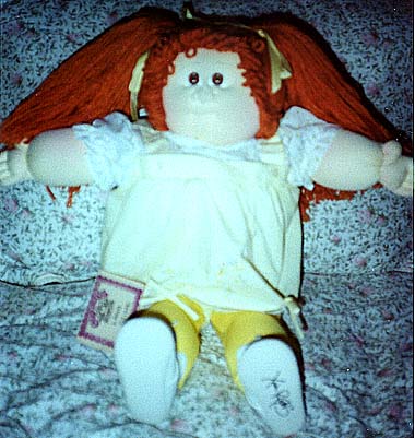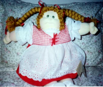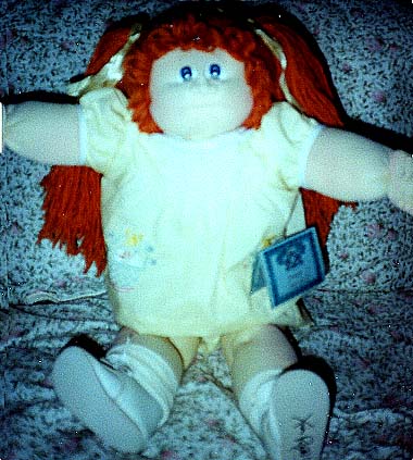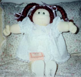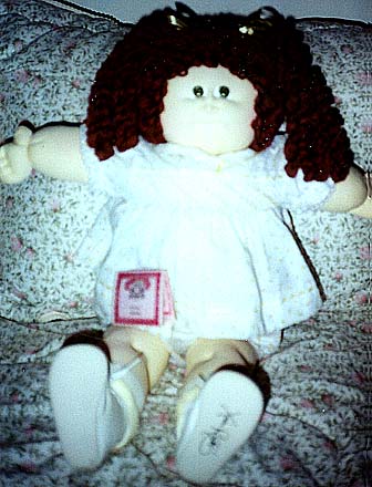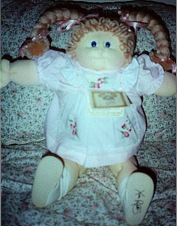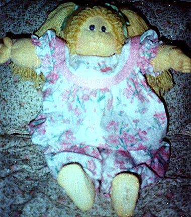 Amber is a 1984 KPZ Bronze Edition baby. She has gold braids, green eyes and freckles! She is wearing her original clothes. I got her at a doll show in May, 1999. She was my first soft sculptured CPK and what started me collecting CPKs again. |