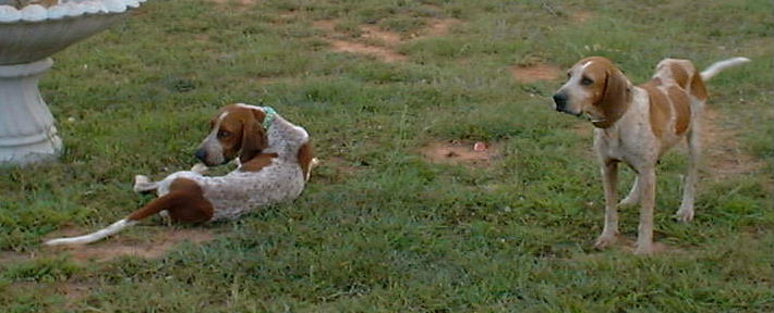 Rooster is sired by the great Dual Grand Champion PR Michigan Swamp Rooster and PR Summers Tenn Goose. Goose is a daughter of World Nt.Ch.,GR Nt.Ch Cowles' Big River Jesse and GR Nt.Ch,Ch Pr Bowling's Little Goldie. Rooster loves to hunt but I have always been afraid to let Scarlett hunt him professionally for the risk of something happening to him. As you can see he is quite a rotten dog!!! Ironically, Rooster was hit by a truck and killed in our own driveway. We will all miss him dearly....