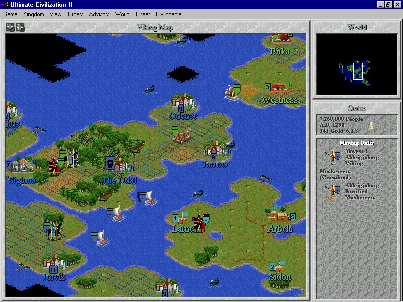Of course you are not alone in the world. As you explore you come across other nations, played by the computer, or in the multiplayer version played by other human beings. You have to decide whether to fight these nations and gain control of their land, or sign an uneasy peace treaty, or a full blown alliance.