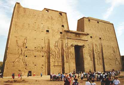 | Many tourists combine a visit to Luxor with a three or four day cruise up the Nile to Aswan. These cruises are often available as an optional extra from tour reps. in Luxor hotels and can be great value for money at around £100 to £150 for the four-day cruise. On the second day of your cruise you will visit Edfu to see the magnificent Ptolomaic temple there. During the last three centuries B.C. the Greeks ruled Egypt and built several temples in the style of those constructed by the Egyptian pharaohs over 1000 years earlier. This is the best preserved and gives the visitor the chance to walk around a temple, which is almost in its original condition.