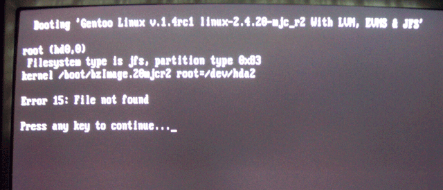 No kernels but "Gentoo Linux v.1.4rc1 linux-2.4.20-lolo_r1_pre1 With LVM & JFS" will boot.