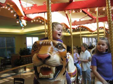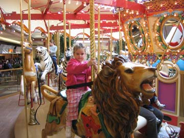 Today Hannah and Dad went to the mall to ride on the new carousel. Hannah took two turns. The first ride she went on the Elephant and the second ride she went on the Lion. We then went to Barnes and Noble and meet Curious Gorge.
