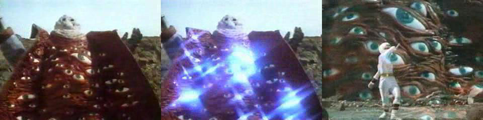 After a fight between the Rangers and the Tenga Warriors, which the Tengas lost, Rita wanted to fight back. With Lord Zedd busy fighting the White Ranger, she had Finster create a monster to battle the Rangers, and so he sent See Monster. Assaulting the Rangers with telepathic waves from his numerous eyes, See Monster's attack was foiled when Rocky visualized pushing the waves away, then attacked See Monster and told the others to do the same. When Rita summoned the Shogun Zords, See Monster teleported away, but when the Rangers gained control of the Zords, an enraged Zedd made See Monster grow. Blasting the Zords with energy beams from his eyes, See Monster soon found himself face-to-face with the Shogun MegaZord, which destroyed See Monster with the Fire Saber.