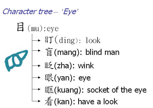 Lesson3: Characters tree: 'Character tree' is a way to put some characters together, the root of the tree is a basic character, the trunk and leaves of the tree are all the characters which have this basic character as their part. Here are some character trees of 口mouth, 人person, 水water,木tree,日sun,土earth, 力strength,女female, 山 mountain, 火fire, 舟 boat,刀knife, and 目eye. Click the words you want to learn. These are just examples, not all the related characters in these trees, when your vocabulary grows, you can make these tree bigger.