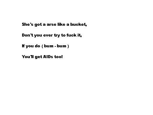 This a cool song written about Sarah. Now, to set the scene, she has a HUGE arse! I mean, we are talking at least 2 stone per arse cheek here. You know when you see a pregnant woman, who is a matter of days away from giving birth? Can you picture that woman from a side view? Do you see how her body is shaped with the baby? See how it sicks out? Well that my friend, is how Sarah's arse sticks out! Anyway, as i was saying, this song was written about her. I think i was sat at the bar drinking when i wrote this. This song makes me smile everytime i read it. If you ask Shaun about this song, he will sing it to you. It's become a big hit at work too!