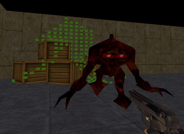 | In Dark, there are two classes: soldiers and hunters. In any game there is only one hunter, and as many soldiers as desired by the hosting server. The soldiers have the advantage of superior weaponry, but the hunters have superior vision. The core gameplay is based on the advantages and disadvantages of light. The game takes place in unlit environments, so the soldiers must carry dim flares if they have any hope of defending themselves against the hunters. Gunfire lights up immediate areas but causes light to dim afterwards, as soldiers' eyes readjust to the darkness. The hunter only has a melee attack, but can see far better in the darkness than a soldier. | ![]() |
