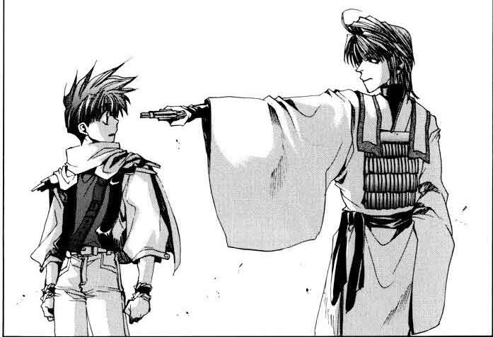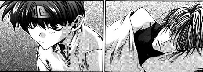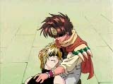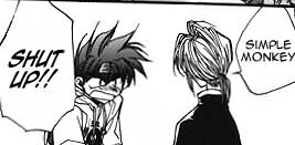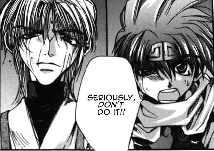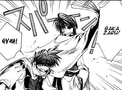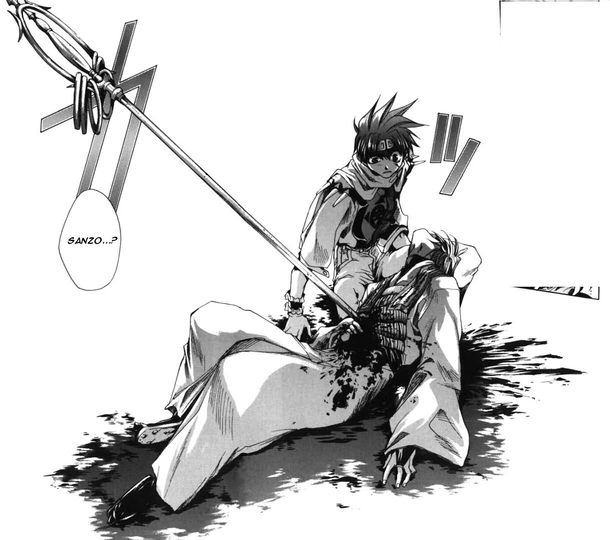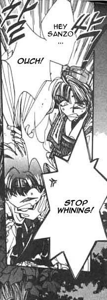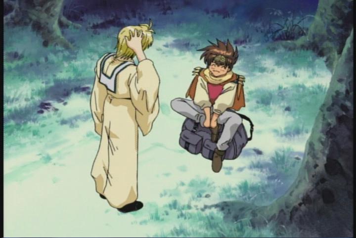 Goku sitting on the bag and Sanzo with his hand on his head-----------------------------------------------------------------------------------------------
