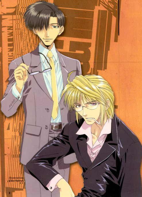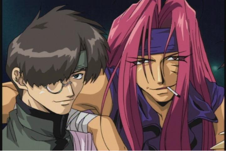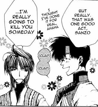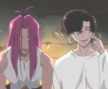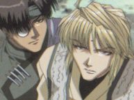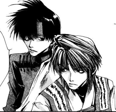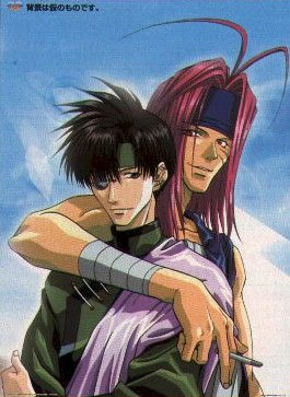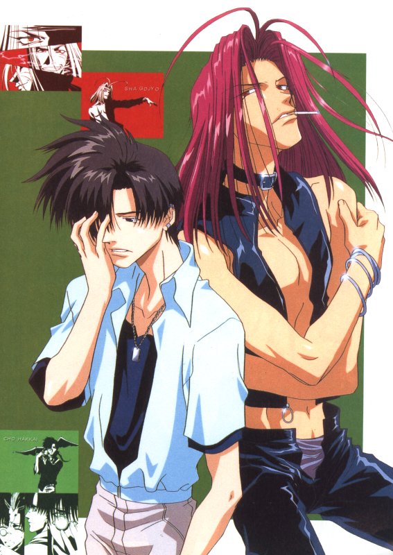 Gojyo with his arm on Hakkai's shoulderSanzo and Gojyo