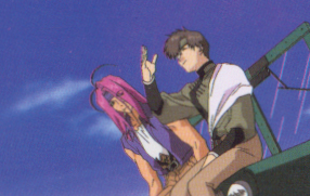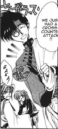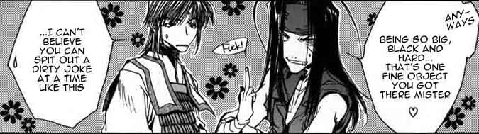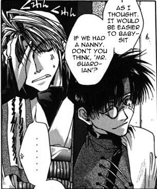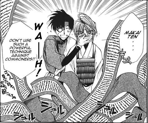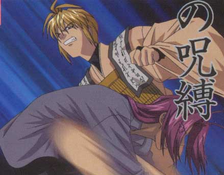 Hakkai stopping Sanzo from using the Evil Sutra. As you can see, Sanzo is drunk.