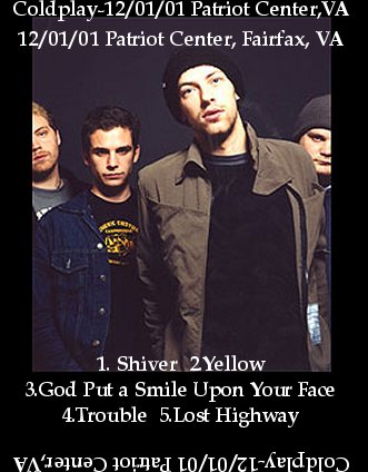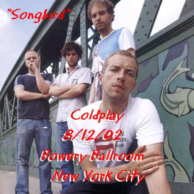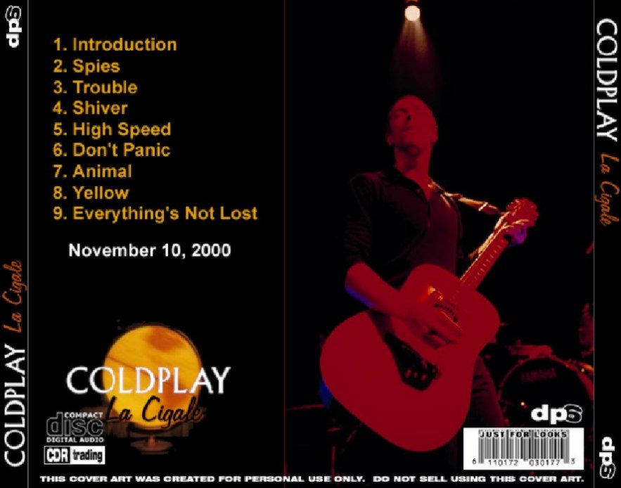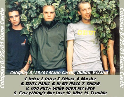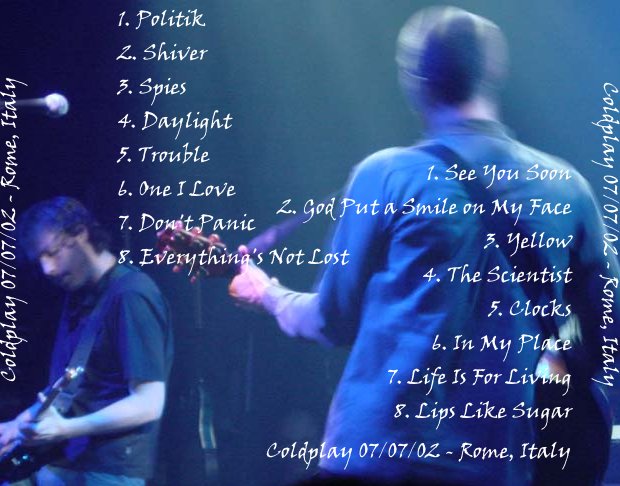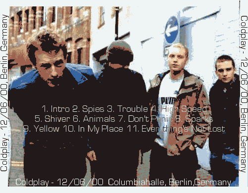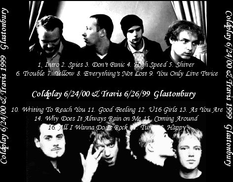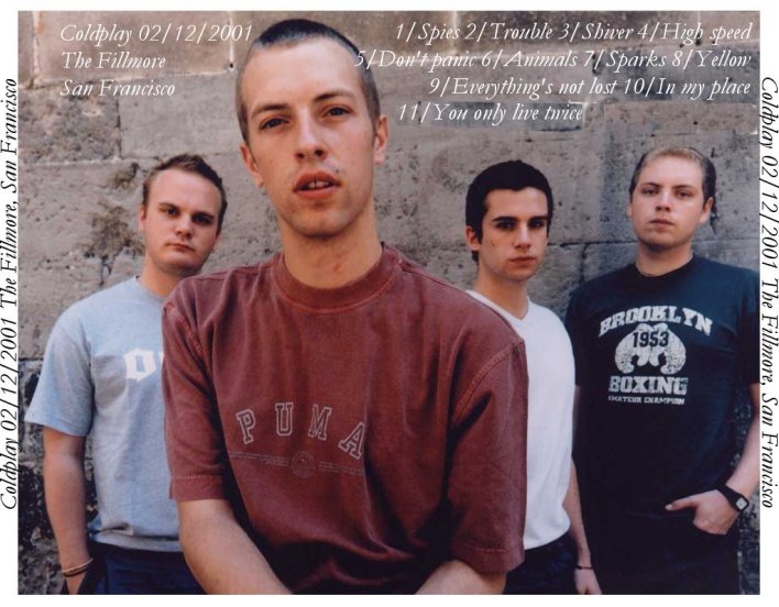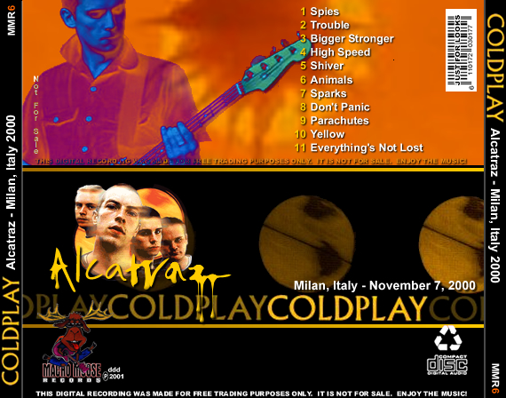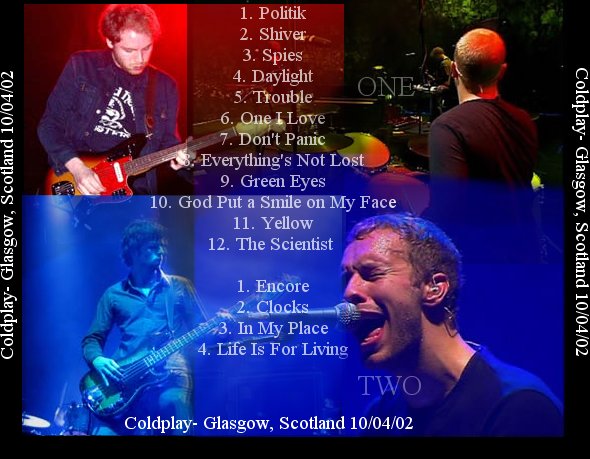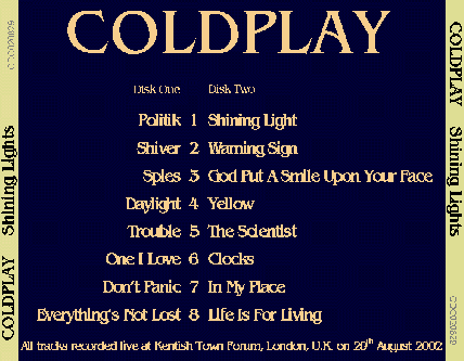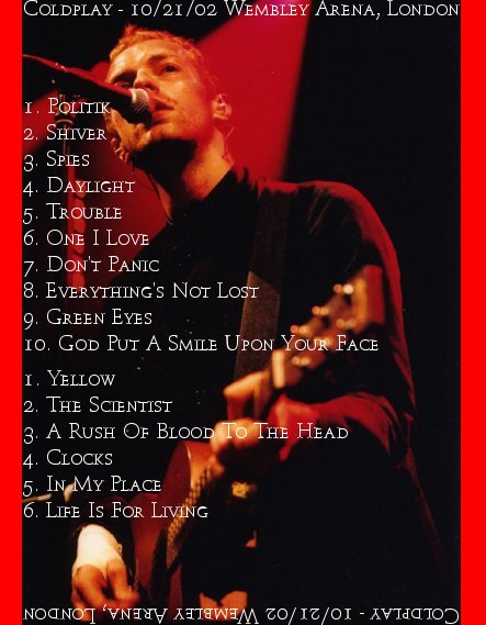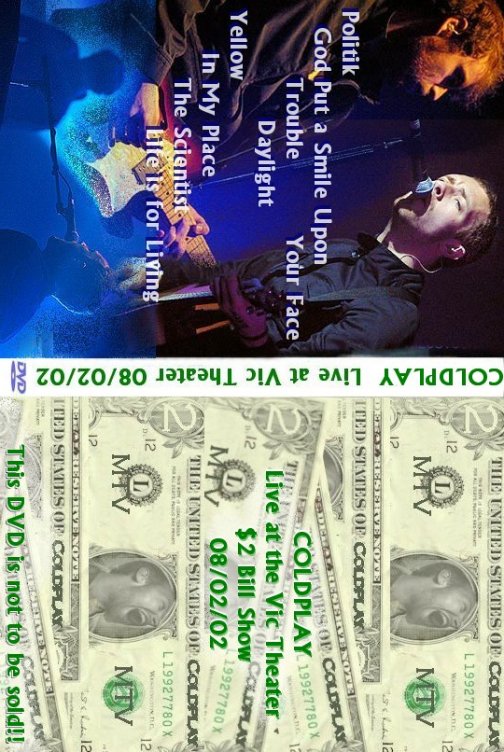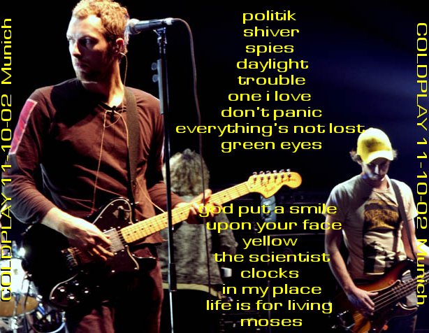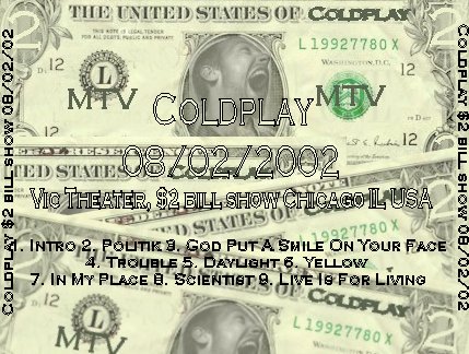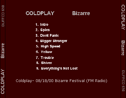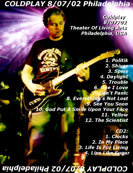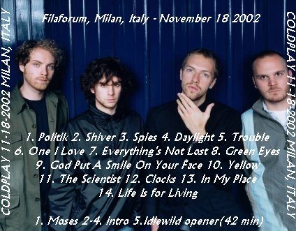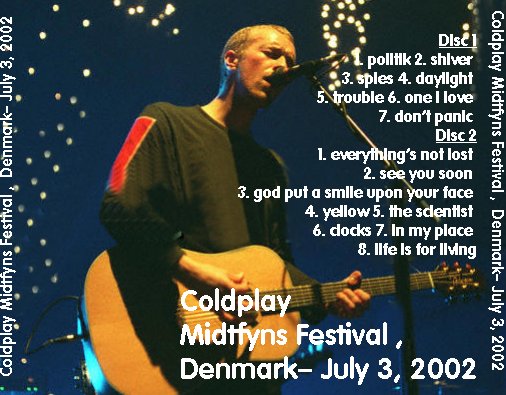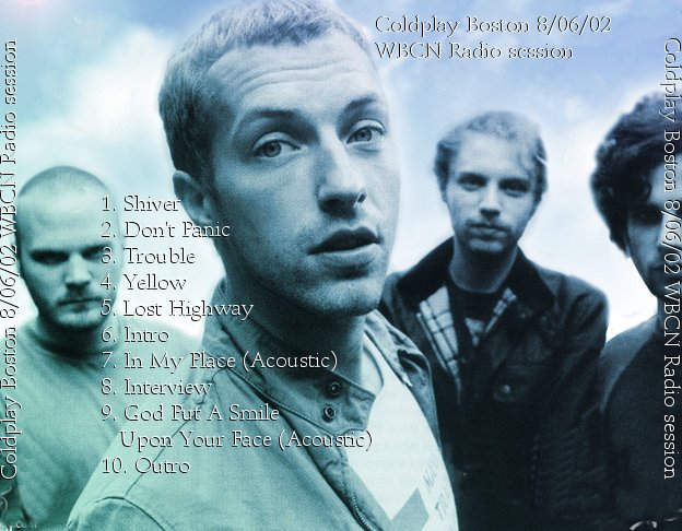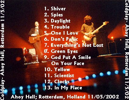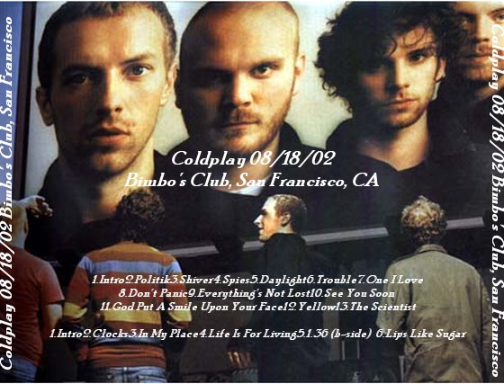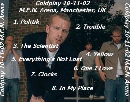 This archive is intended to provide anyone who is interested in Coldplay bootlegs or concerts with a cover belonging to the bootleg or concert. I do NOT sell these bootlegs. I do NOT distribute them, or help anyone to buy them. I am NOT encouraging anyone to buy them. I encourage those who see bootlegs for sale to report them to whatever authorities can stop their practices. Finally, i do NOT want this archive being used by or in conjunction with any commercial enterprise, whether for profit or otherwise. I want my position on these matters clear.