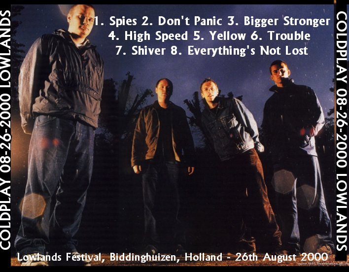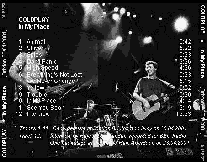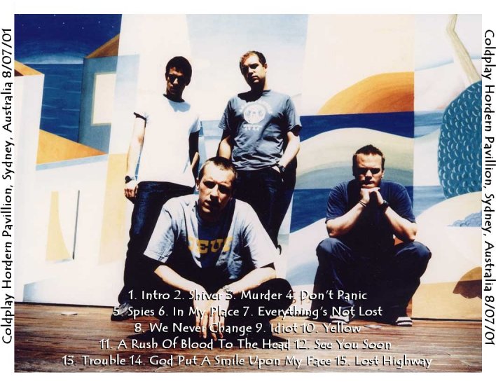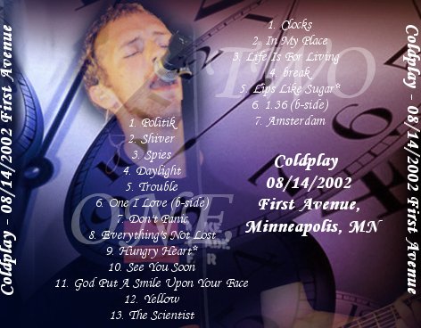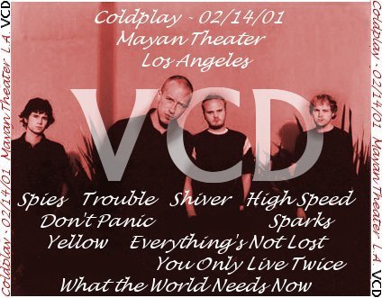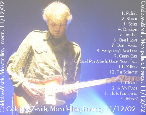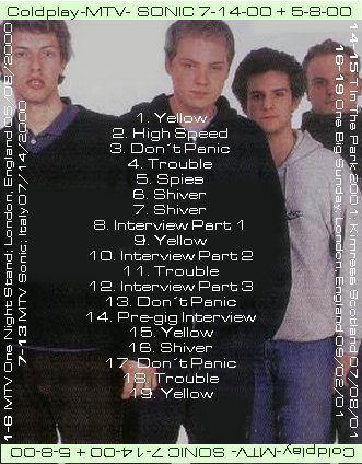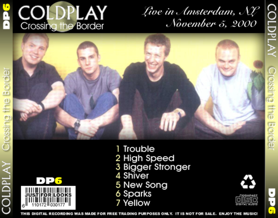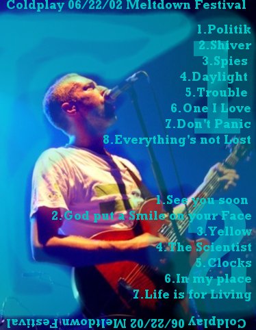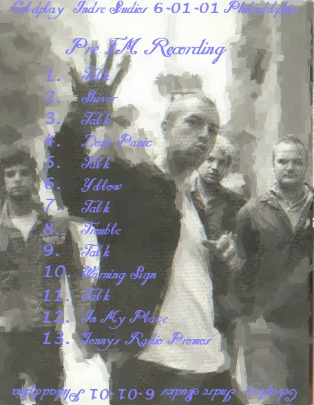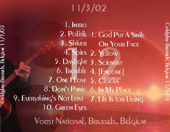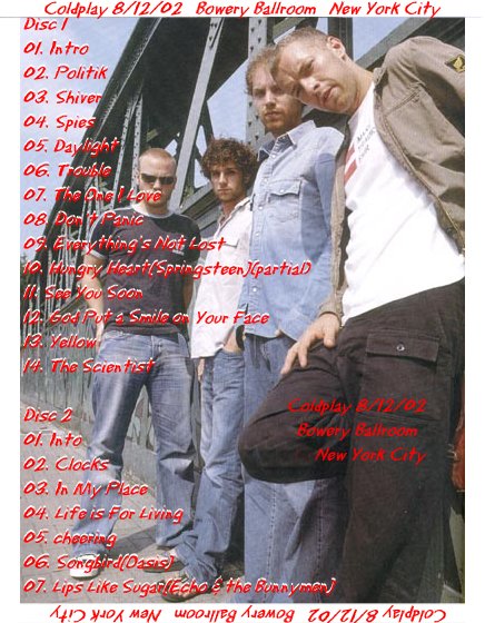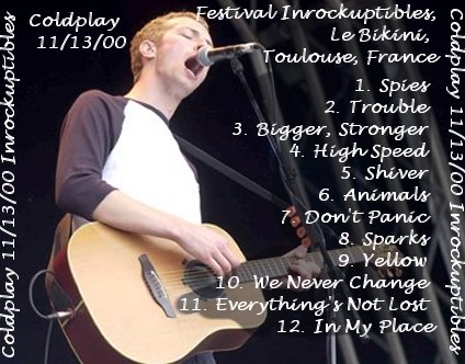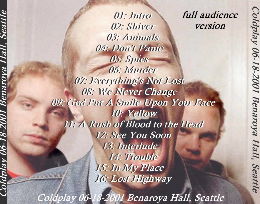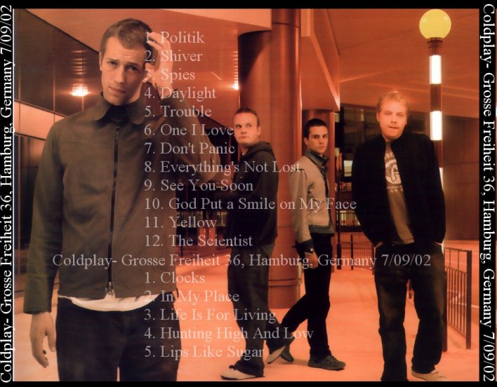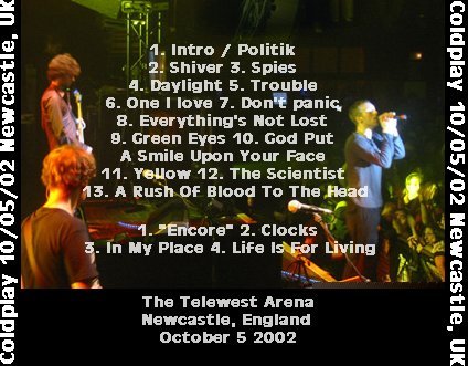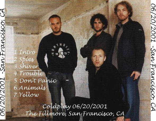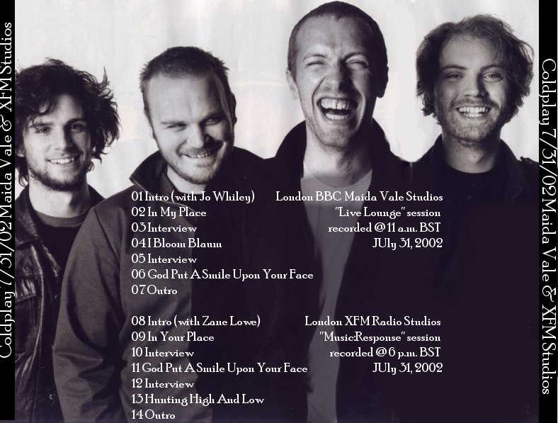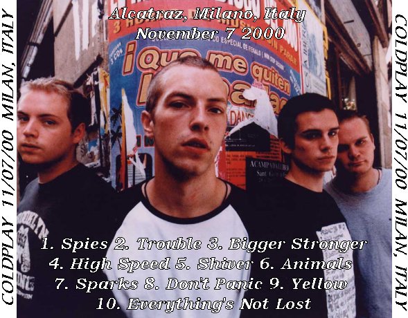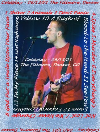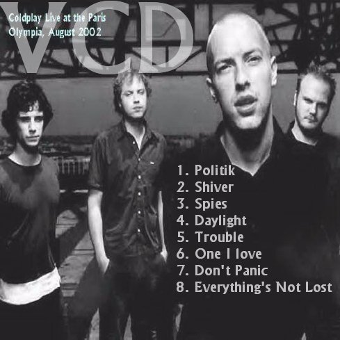 This archive is intended to provide anyone who is interested in Coldplay bootlegs or concerts with a cover belonging to the bootleg or concert. I do NOT sell these bootlegs. I do NOT distribute them, or help anyone to buy them. I am NOT encouraging anyone to buy them. I encourage those who see bootlegs for sale to report them to whatever authorities can stop their practices. Finally, i do NOT want this archive being used by or in conjunction with any commercial enterprise, whether for profit or otherwise. I want my position on these matters clear.