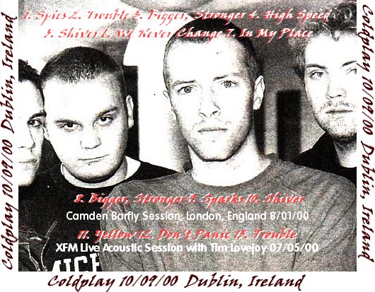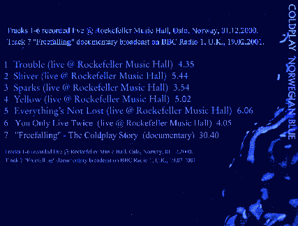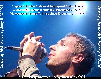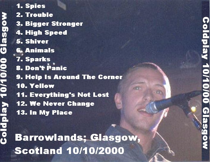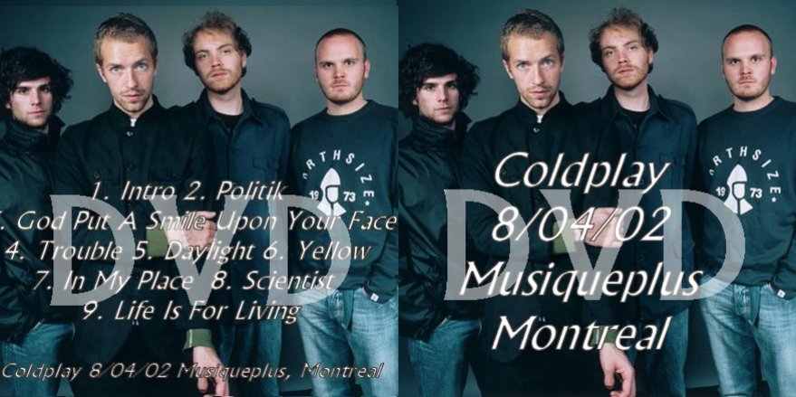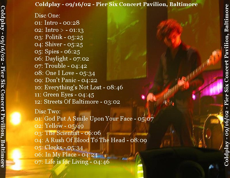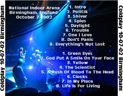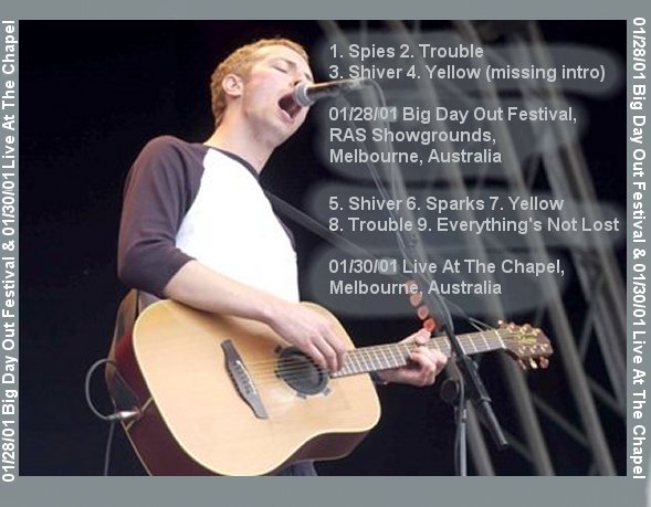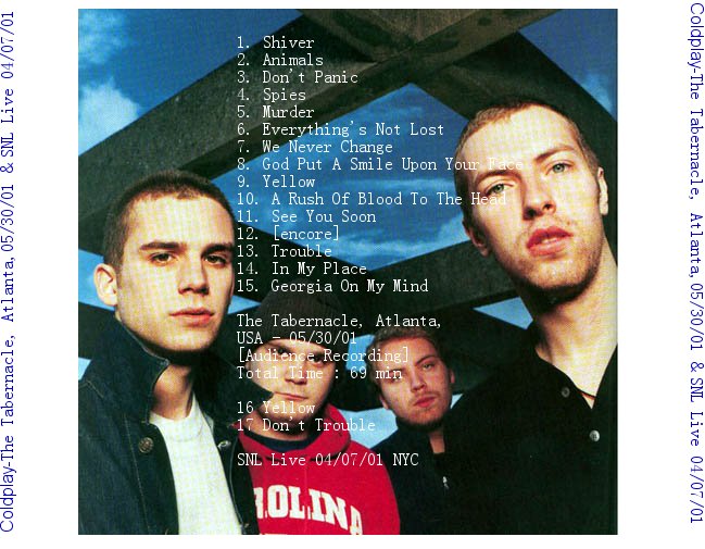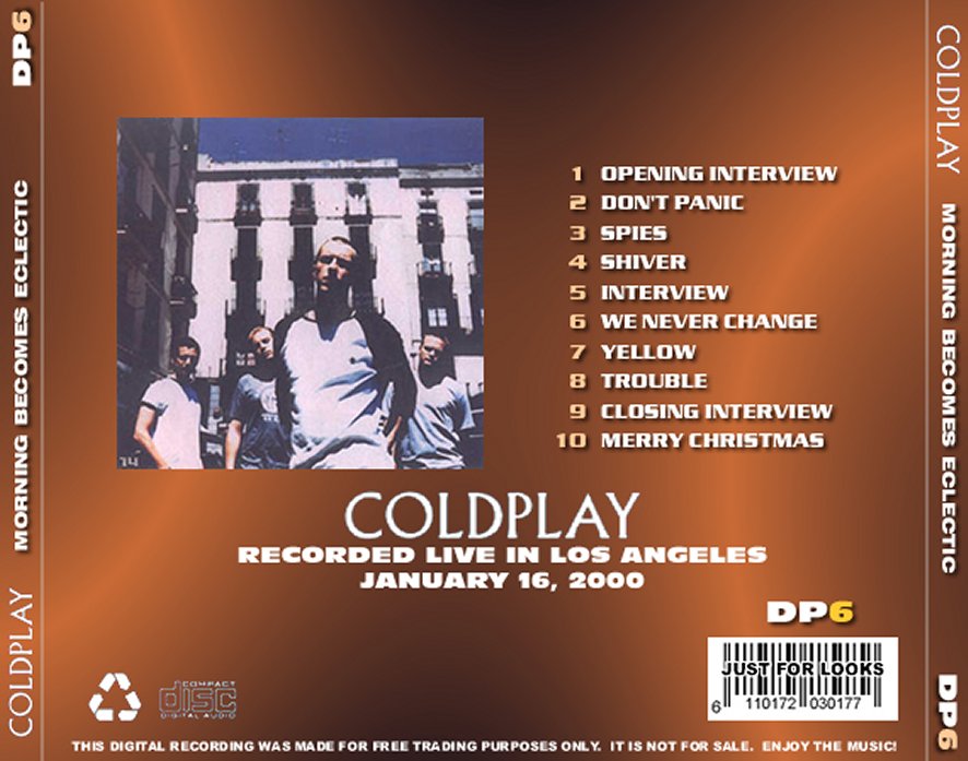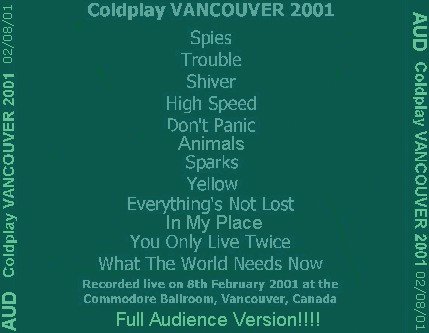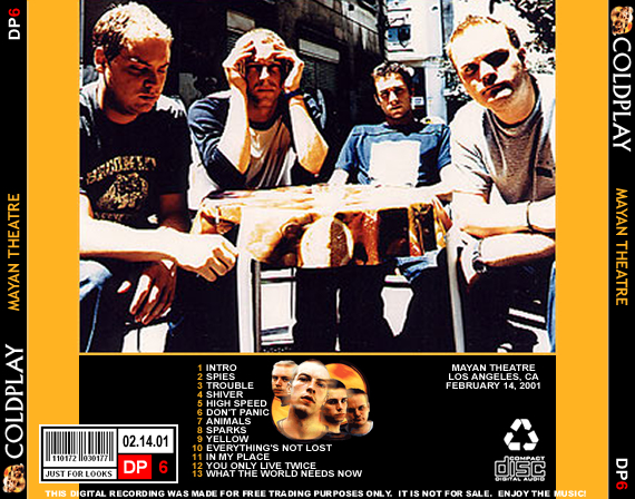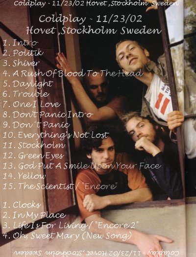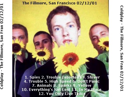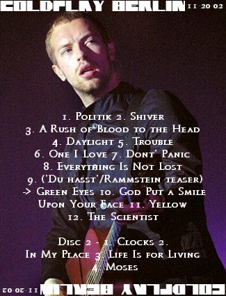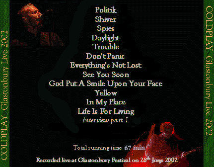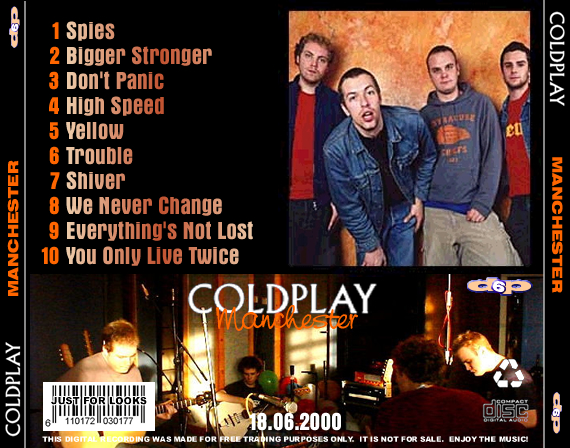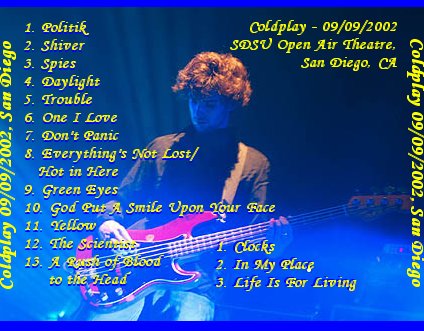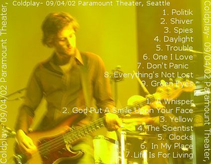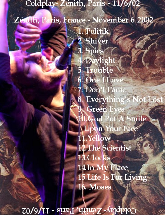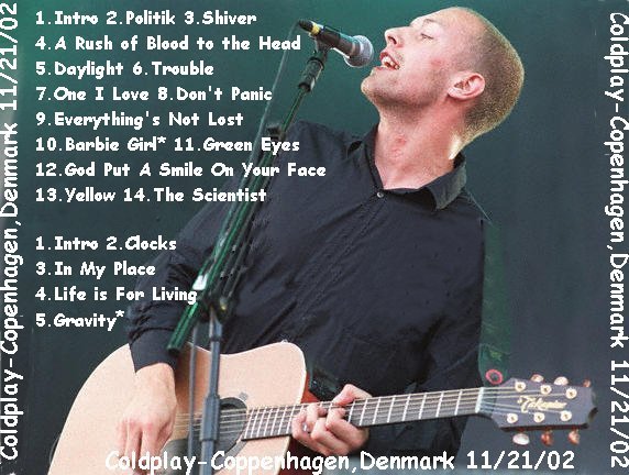This archive is intended to provide anyone who is interested in Coldplay bootlegs or concerts with a cover belonging to the bootleg or concert. I do NOT sell these bootlegs. I do NOT distribute them, or help anyone to buy them. I am NOT encouraging anyone to buy them. I encourage those who see bootlegs for sale to report them to whatever authorities can stop their practices. Finally, i do NOT want this archive being used by or in conjunction with any commercial enterprise, whether for profit or otherwise. I want my position on these matters clear.