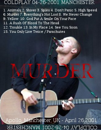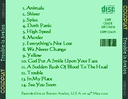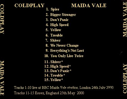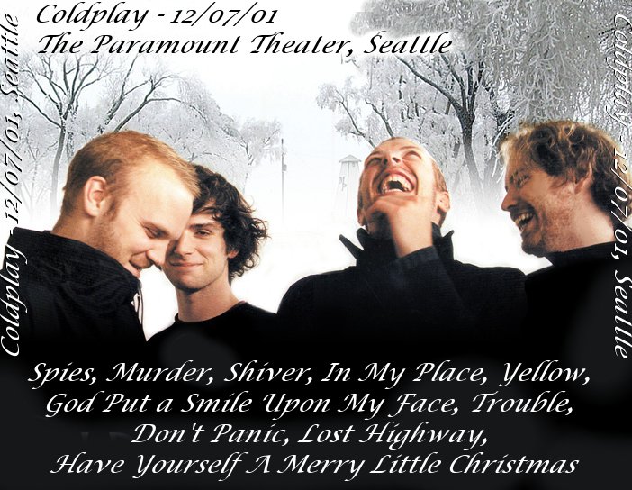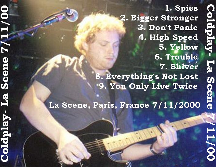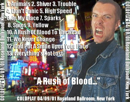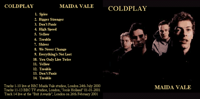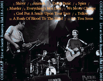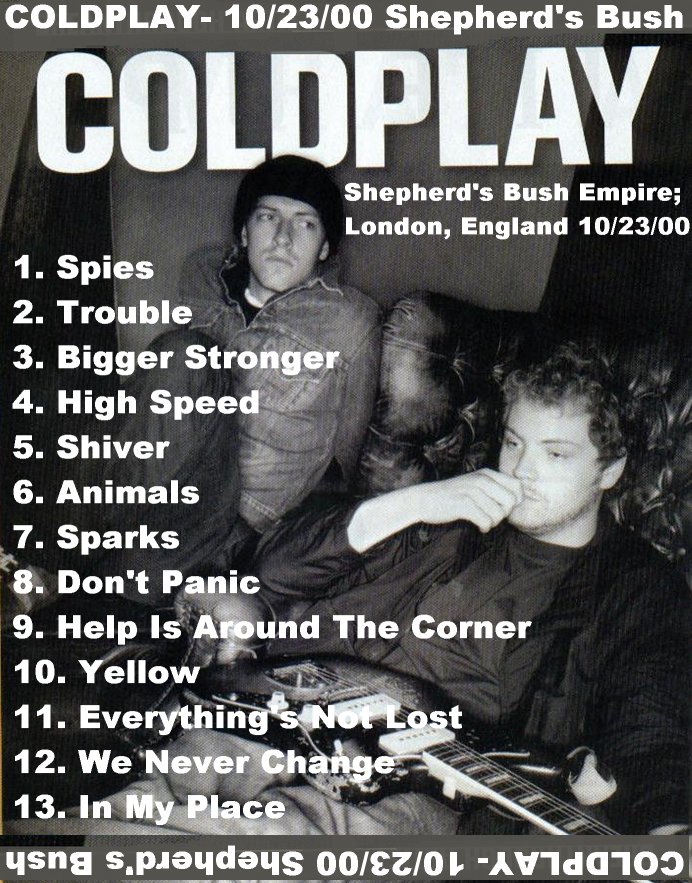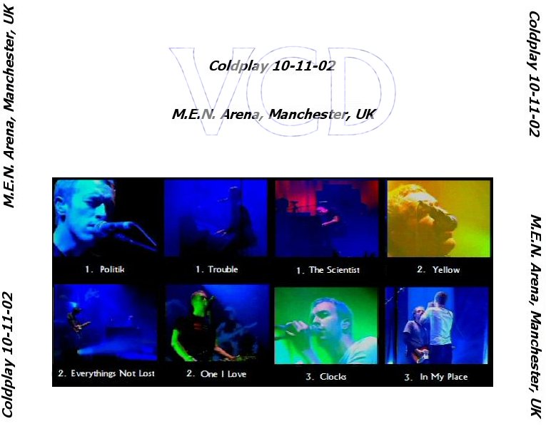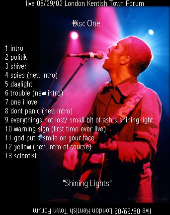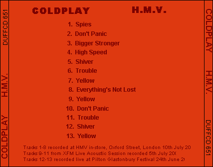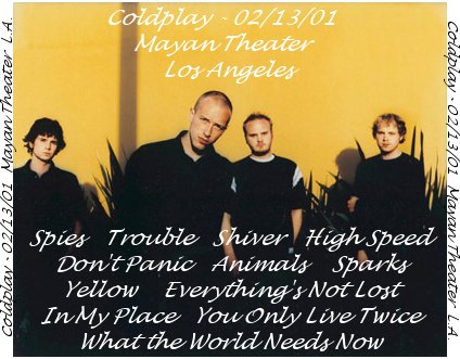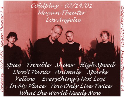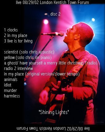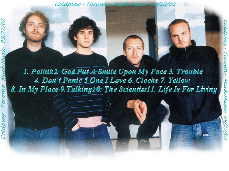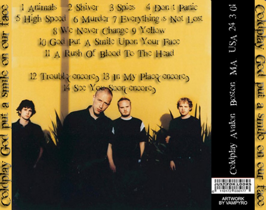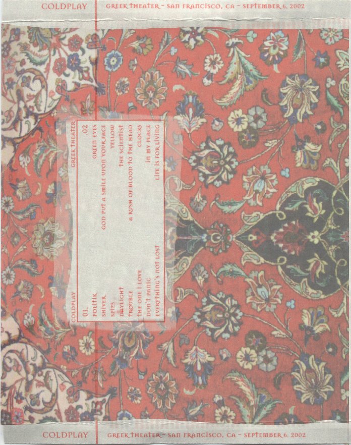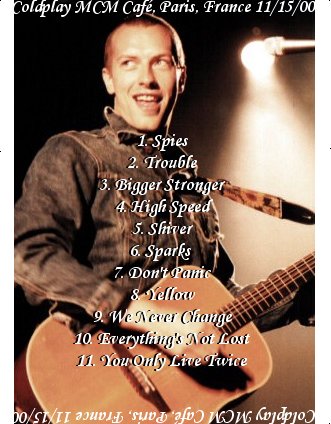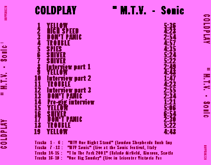This archive is intended to provide anyone who is interested in Coldplay bootlegs or concerts with a cover belonging to the bootleg or concert. I do NOT sell these bootlegs. I do NOT distribute them, or help anyone to buy them. I am NOT encouraging anyone to buy them. I encourage those who see bootlegs for sale to report them to whatever authorities can stop their practices. Finally, i do NOT want this archive being used by or in conjunction with any commercial enterprise, whether for profit or otherwise. I want my position on these matters clear.