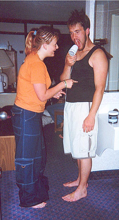 Tony blowdrying his mouth. I forgot why...hehe. Lisa is standing next to him with her KICKASS pants and braided hair [by teonte] we're all in there watching some sort of movie. i think.