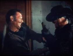 (Zorro has followed one of the badidos to the cabin where they are holding Bernardo hostage. Zorro tries to wrestle the rifle away from the bandido.) |
