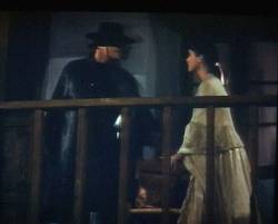 (Zorro has retrieved the ransom money from the kidnappers and is returning it to Anna Maria, assuring her that her father is safe.) next back Table of Contents |
