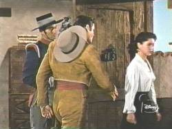 (Diego and Anna Maria have attempted to free Ricardo, who is about to be hanged as Zorro. The Commandante is angry because of Ricardo's practical jokes, two of which ended up embarassing the Commandante. He said that Ricardo will hang, and ordered a soldier to escort Diego and Anna Maria back to the Inn and see that they remain there until after the hanging.) |