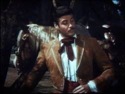 (Uncle Estevan has a plan to trap Zorro. He gets Corporel Reyes to dress up as a senorita. Sergeant Garcia will be hiding among the rocks. When Zorro appears, they will capture him.) |