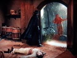(Zorro and Miguel have successfully defeated the men that killed Don Hilario when it begins to rain. The relief and joy is evident in Zorro's expression.) |