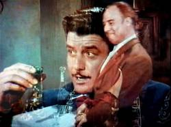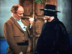 But Diego, despite the tension of sitting across from the man whom he just crossed swords with as Zorro, notices Bernardo’s wistful expression. In a lovely moment which I think embodies why their relationship is so valuable and meaningful to us as viewers, says, “Even Zorro must have a friend. I would like to toast that friend.” It goes right over everyone’s head but right to Bernardo’s heart, and he smiles, pouring a drink to toast himself (which in typical Gene Sheldon fashion he turns into a clever little bit of comedy as the glass overflows.) Submitted by Shari Ann next back Table of Contents |