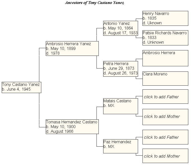 Thank you for visiting my page at Angelfire. This is my effort to locate my ancestors. Much of the information is gathered from rumors. Things that I heard as I was growing up from my parents and uncles and aunts. Unfortunately, these sources have died and I have very little information to fall back on. Hindsight is 20/20 and now that I am getting older I realize that these individuals were responsible for who I am and who my children will emmulate as they also grow older. I am the grandson of Antonio Yanez and Petra (Herrera) Yanez. My grandfather was born in 1864 and married my grandmother in 1891. Much of the information about them was gathered from www.historicdistrict.com and Frio County. They are buried at Longview cemetary with my uncle Simon, his wife and a daughter. There is also another uncle buried there, but I never got to meet him. I am the son of Ambrosio Yanez and Tomasa (Castano) Yanez. My father was born in 1899 in Devine, Texas. My mother was born in 1900 in Lytle, Texas. They married and lived most of their lives in San Antonio, Texas. They had many children and I am the sole male still alive from that union. Alfredo was the oldest he moved to Chicago, Illinois and lived there most of his life. Trinidad was second he stayed in San Antonio. He was exceptionally tall and was very proud of having served in World War II. Emillio also served in World War II as a tail gunner and once sent a post card home that read "Look out! Emillio is flying the airplane". Fredrico was a twenty (20) year old marine when he died suspiciously while under police custody. Alfredo died and was burried in Chicago. Trinidad, Emillio and Fredrico are burried at the Fort Sam Houston National Cemetary in San Antonio. Amborse (junior) was two years older than I and was known as "Killer" by many of his friends. I don't know if it was because of his good looks or because he liked the music of Jerry Lee Lewis. He was the person with the million dollar personality. He died last year (2003) and was buried at San Fernando Cemetary in San Antonio. I had four sisters, two are still living today. Maria Aguirre, and Tomasa Rymers are their names. Eloisa Morales was the eldest (born 1924) daughter. She had a rock steady personality. She would stay the course come hell or high water. She died 17 June 2004 after 80 productive years. Elvira Chavarria was the most attactive of all the daughters, she was a little on the wild side and will be missed for many years. Please come back and visit again! I promise to keep adding more information as I find out more about my grandfather and gradmother and their parents.