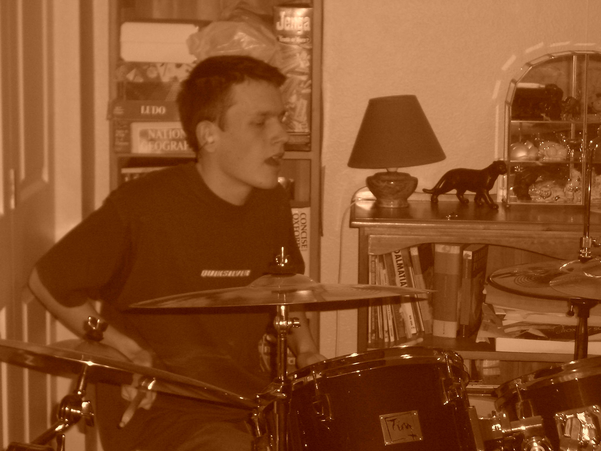 I play a starter Stagg kit :( but have ungraded my Cymbals to and 20" Sabian Pro Sonix Ride, a 16" Sabian Pro Sonix Crash, 14" Sabian Pro Sonix Hats, a 14" Sabian AA Medium Thin Crash and a 10" Paiste Alpha Splash. Also, I have recently aquired a new snare, possibly the nicest drum in the world, a Yamaha Black Maple Custom Absolute 14" x 6" snare. To cap things off I have a rather nice DW 7000 Double Bass Pedal, and I play with Dave Weckl signiture sticks in honour of the great man, who is the best drummer I have heard out there today, if they help me play to even a tiny fraction of his abilty I will be happy! Days till my birthday! ||| Home |||
