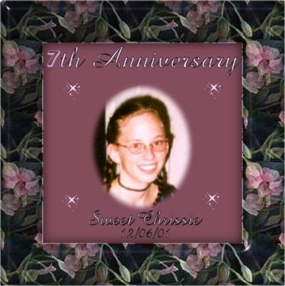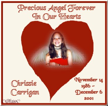 ![]() ![]() Chrissie's trip of a lifetime. ![]() ![]() ![]() ![]() ![]() ![]() ![]() Chrissie Carrigan November 14, 1986 - December 6, 2001 ![]() ![]() ![]() ![]() ![]() ![]() ![]() ![]() ![]() ![]() ![]() ![]() ![]() ![]() ![]() ![]() ![]() ![]() ![]() ![]() ![]() ![]() ![]() ![]() ![]() ![]() To bring you to our minds. The days we do not think of you Are very hard to find. Each morning when we awake, We know that you are gone. And no one knows the heart ache As we try to carry on. Our hearts still ache with sadness And secret tears still flow. What it meant to lose you No one will ever know. Our thoughts are always with you, Your place no one can fill. In life we loved you dearly; In death we love you still. There will always be a heartache, And often a silent tear. But always a precious memory Of the days when you were here. If tears could make a staircase, And heartaches make a lane, We'd walk the path to heaven And bring you home again. We hold you close within our hearts; And there you will remain, To walk with us throughout our lives Until we meet again. Our family chain is broken now, And nothing seems the same, But as God calls us one by one, The chain will link again. ~ Written by Connie Dyer, BP/USA, Springfield, IL ![]() ![]() ![]() ![]() ![]() ![]() ![]() ![]() ![]() ![]() ![]() ![]() ![]() ![]() ![]() ![]() ![]() ![]() ![]() ![]() ![]() ![]() ![]() ![]() ![]() Chrissie tried for October 21, 1986, but doctors managed to stop her. For if that date was to be the case, we may not have managed to have kept her on Earth with us as long as we did - 15 years, 22 days. ![]() with a sense of urgency - living each day to the fullest. Chrissie was a social butterfly, and made friends like bees make honey. Her friendships spanned across the globe. ![]() 2 days in the hospital, and the first 2 months, 2 days in the isolate. We finally got to hold her after 2 weeks. Chrissie spent the first year and a half on oxygen, and the first year and ten months on an apnea monitor. Several times, we had the monitor go off in the night. Each time, we were given our Angel back. ![]() which eventually became Asthma. Unable to walk or talk for the first several months, Chrissie used sign language as a means of nonverbal communication. She received home schooling from wonderful and talented teachers and therapists of the Ivymount School. These skilled and caring people helped her develop, while keeping me sane. ![]() she developed auditory processing dysfunction. Chrissie had difficulty understanding the words spoken to her. With a personal fm system, she could understand and she started to excel in school. Chrissie suffered from acute mold allergies and missed so much school in the fifth grade that she had to be home-schooled that year. Chrissie went back to school in the sixth grade. On top of the regular stress of handling a full load, Chrissie was exposed to endless teasing, and had to make new friends since the school district had shifted boundaries, forcing her to attend a different school. ![]() ![]() Chrissie excelled in her studies. ![]() and lip sync contests. Even though she was rather shy, she overcame that when she competed in these contests. She surprised many people with her angelic voice. ![]() very well. Chrissie introduced Mai to American traditions, such as Halloween, sleepovers, New Year’s Eve, and the Fourth of July. They learned from each other. With Mai’s help, Chrissie learned how to speak, write, and read Japanese. ![]() about being fat, even though she was quite petite. She became very self-conscious, and started to walk more and ride her bike every day. ![]() with Cinderella's castle in the background. ![]() ![]() ![]() ![]() ahead of her. As the teasing continued, she became more and more unhappy, and she lost more weight. ![]() Chrissie joined the Peace Club at school and helped her school be one of the school to obtain a Kaki Tree (second generation of the tree). The Kaki Tree is the tree that survived the bombing of Nagasaki, Japan. Chrissie was loved by family and friends. ![]() and Dissociative Identity Disorder), she always had a smile and kind word for everyone. in fifteen years than most people do in a lifetime - and she did it with grace and love. ![]() (Ivymount School and Northwest High School) that have been set up in her name. and related neural illnesses. We hope that her memorial scholarships and the donation of her brain tissue will enable future high school students to go to college and help future teenagers to live without depression. “Well, duhh!” Most of all, I will miss her “Love You More and Love You the Most” to my “I Love You!” ![]() she lived with 5 personalities after she died and we got to read the journals that she left. The one personality that was the strongest was the one that talked of killing Chrissie. This is the personality that we believe took over at the end. ![]() ![]() Mom (Kathie) ![]() ![]() ![]() ![]() ![]() ![]() ![]() It was our last day and she was missing Lace. ![]() ![]() It is often evaded but impossible to escape. In death Chrissie Carrigan brought this school together in such a way that is indescribable, but even more, she helped people in life. She affected numerous people daily with her brightness and insight on life. Many students who came in contact with Chrissie were often happier after hearing a cheerful “coolies” or listening to her expound on saving the buffaloes. No words could give justice to who Chrissie really was and how much she lived life to its entirety. She died young but not without leaving her mark on the world and an impression on the hearts of many. By Emily Thoresen, 2002 yearbook. ![]() Maria - this was what Emily wrote for Chrissie's yearbook in 2002. This is from the best friend Chrissie had in school at the end. This is also the young lady that brought me a ticket to go to graduation for her. ![]() ![]() ![]() ![]() Geoffrey P. Edwards ![]() ![]() But in our hearts you are always th