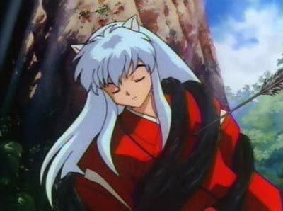 Inu-Yasha is the main character, obviosly. His name literally means 'Dog Demon', even though he's only half demon. Because he's half human (his mothers side) He turns human on the night of a full moon, and when he does, he loses all his demon abilities, and his hair and eyes go darker.