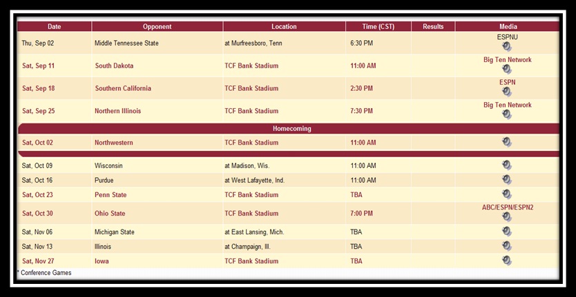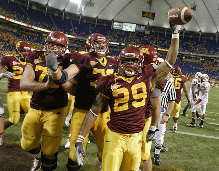 The University of Minnesota Golden Gophers are one of the oldest programs in college football history. After their 8–2 record in 1967, the Gophers would not win 8 games in a season again until they went 8–4 in 1999. Their 10–3 record in 2003 gave the Gophers their first 10 win season since 1905. Throughout the years the Golden Gophers have claimed 6 National Championships, 18 Big-Ten Conference titles, and have 14 bowl game appearances. The Gophers are led by their new head coach, Jerry Kill. Minnesota will not be appearing in a bowl game this season. Click on the picture at the bottom of the page to view the team's roster.