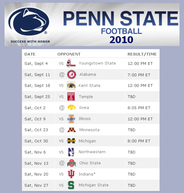 Penn State Nittany Lions football is a college football program from Penn State. It competes in the NCAA Division I Football Bowl Subdivision and the Big Ten Conference. It is one of the most tradition-rich college football programs in the United States. On November 22, 2008, Penn State became the sixth FBS program to win 800 games after defeating Michigan State.Penn State is often referred to as Linebacker U for its reputation of producing outstanding linebackers. Head coach Joe Paterno has amazingly been coaching the Nittany Lions since 1966. "JoePa", holds the record for the most victories by an FBS football coach, has coached more bowl game wins than any other coach in college football history and is the first FBS coach to reach 400 victories. The Nittany Lions have won 2 National Championships, 3 Big-Ten Champioships, and have appeared in 42 different bowl games. Paterno and his Nittany Lions will face the Florida Gators in this years Outback Bowl on New years day at 1 pm.