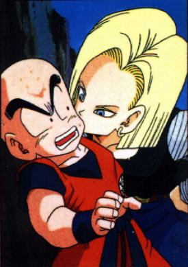 This is how it all became. Juuhachigou and Juunanagou were normal humans once, but were converted onto artificial humans by Dr. Gero in hope that they would kill Son Gokou. But juunanagou killed him instead. The three of them then went in search of Gokou, who incidentally had a heart problem and was resting in Kamesennin Mutenroshi's house. Only Kuririn who didn't join in the fight was left standing, and Juuhachigou gave him a farewell kiss on the cheek as the jinzouningen left. Later on, Cell came into the picture. He wanted to search for Juuhachigou and Juunanagou so that he could combine with them to become Perfect Cell. He managed to catch Juunanagou first, and Bulma, fearing that Cell would succeed in combining with Juuhachigou, created a remote control device which would deactivate Juuhachigou when the button was pressed. The thing was, the remote could only work if it is 10 metres or less from the target. So Bulma handed the task of deactivating Juuhachigou to Krillyn(smart idea bulma:p) Kuririn soon got his chance - but lost it for he couldn't bring himself to kill the jinzouningen for he couldn't keep the image of when she pecked him on the cheek out of his mind so, he smashed the remote instead and told Juuhachigou who had turned to him to run. Cell then noticed Juuhachigou, did a Taiyouken which blinded everybody else and sucked Juuhachigou into his body using his tail while everyone was rubbing their eyes. Thus he became Perfect Cell. Cell spewed up Juuhachigou some time later when he was fighting with Gohan and the later gave him an especially hard hit. Krillyn instantly carried her to safety, Juuhachigou was later revived by Dende at the Kami-sama's palace when everything was over and Cell had been destroyed. Juuhachigou wasn't grateful in the least and flew off after calling Krillyn ' an old man'. When Shenlon was summoned from the Dragon Balls to revive everyone who was killed by Cell, Krillyn used the second wish to remove the bombs in the Jinzouningen's bodies which had been planted by Dr. Gero when he converted Juuhachigou and Juunanagou into jinzouningen. When asked by the others why he wished that so, Krillyn replied that he did like Juuhachigou, but he thought that she suited Juunanagou better. At this point Juuhachigou who been spying behind a pillar sprang out angrily and said that she and Juunanagou were actually twins and not whatever Krillyn thought them to be. She paused, then muttered a 'See you again' before flying off. Yamucha was convinced that Kuririn still had a chance with Juuhachigou. Little did Yamucha know that Krillyn did have a chance and 8 years later we see Krillyn living with Juuhachigou in the Kame House, and that's how Krillyn and Juuhachigou got together. The kame house will never be the same agian!
