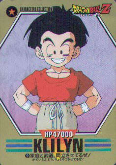 Krillyn is a monk from earth. He meets up with Gokou at training with Mutenroshi and the two become best friends till the end. Even though Krillyn is small and not as strong as the saiya-jins that doesn't stop him from fighting the tough battles. When ever there is a fight Krillyn is usually there. Later on in DBZ Krillyn stops training, grows some hair(black), gets married to Juuhachigou and has a daughter named Marron. Krillen is the strongest out of all the humans and part of the Z Fighters.
