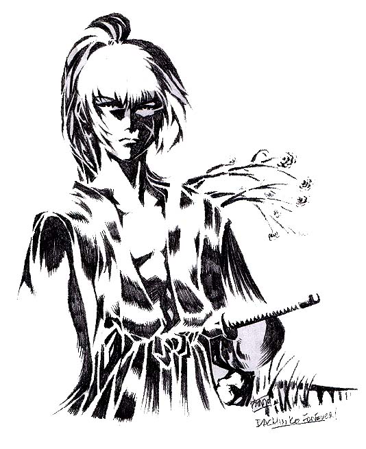 Artist: saint souljirow Character: Kenshin, or is it Battousai? Genre: Pencil drawing. Comments: Awesome! This is an amazing drawing done almost completely in black and white. It has a very shadowy, mysterious look to it. The artist says that this is the impression he got of Kenshin after watching the OVA's. I must say that I agree and I'm honored to have such a great peice in my site. |