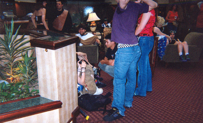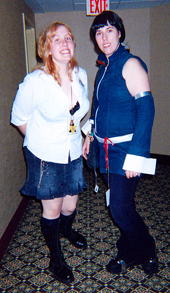 I circled the dealer's room fifty million times, man. All I kept getting was doujin. I mean, pretty straight all I got was DOUJIN. DOUJIN AND MORE DOUJIN. I got, like, freaking SEVEN. o_o They were pretty cheap and not something I could get in MediaPlay/Suncoast/Hot Topic/WalMart for a LOT less. So now I'm up to my ears in PORN :D. MWA HA HA HA HAAA... And I got a tasteful pin-up book by Mr. Mark Rogers, who does Samurai Cat. :D He was cool and kinda looked like Hulk Hogan. Heh. Other regulars of the con were here too: Mr. and Mrs. DeJesus, Greggy Ayres, and Derek (the Gohan/Megaman guy.) Hooray!