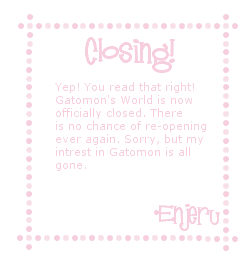 I 'm sorry that I had to do this, but I really have no intrest in Gatomon anymore. I hate to close GW down right after it's first B'day, but I see no reason to keep it open. If you want to visit another one of my sites, visit my shrine to Ken Ichijouji ^_^ Click the ichigo labelled Kind Hearted.
