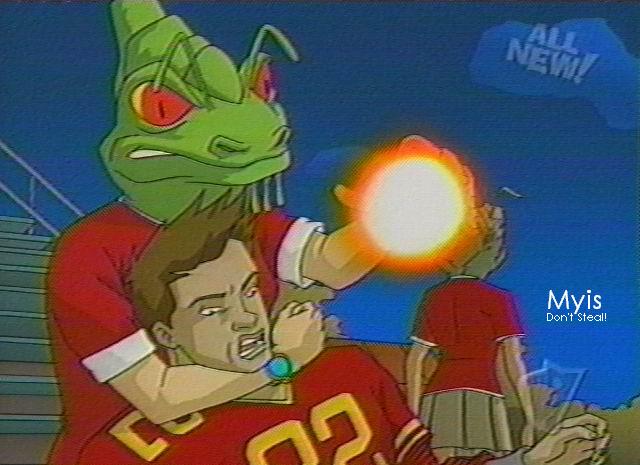 "Prince Popularity? I don't have time to be Prince Popularity," Rex states back. (Okay, I KNOW that this is what he said since I have the whole thing glued to my memory. It's a great moment. Remember, this is Matt's voice saying that. ^_~) After this, two big football jocks come up to them and do the whole teasing and 'Oh, I'm so fly. Flyer than you' thing that stereo-typical jocks do. A fight ensues between them and Jay. Rex is just is in the background, being very quiet. And as if on cue, the principal goes up to them!