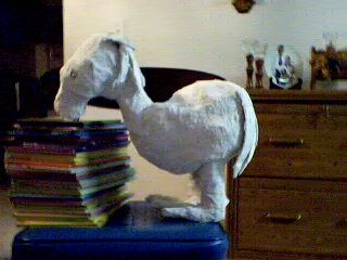 He's made of newspaper (for creating the shape), pariscraft (to cover him up; the white stuff) and acrylic paint. Pariscraft is the stuff that casts are made of, y'know, when you like break a bone.