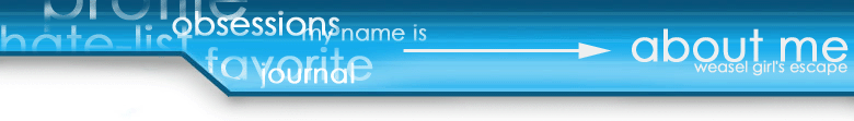 Profile1. Name: Shannon2. Birthdate: 2-6 3. Location: Orange County, California 4. Family: Mom, dad, brother, and pekkle 5. Favorite Drink: Iced Tea, Italian Soda, and Strawberry Lemonade. 6. Favorite Movie: Dogma, Graves of the Fireflies, Amelie, A Walk to Remember ....hahahah just playing. No seriously i am. 7. Favorite Songs (At the moment): "Yubiwa" and "Koucha" by Maaya Sakamoto, "Eden" by Sarah Brightman, "Fix me now" Garbage, "Falling" Ben Kweller, "The First Night" by Monica, "By Starlight" Smashing Pumpkins, "Paralyzed" The Cardigans, "Falling" Our Lady Peace, ok computer. hehe too lazy to look it up. BRMC! Some stuff by The Red Flag is pretty awesome. And Random fun music: "Touch It" Monifa, "More today than Yesterday" Goldfinger cover, "Happy Together" The Turtles. 8. Favorite Bands/Artists: none 9. I'm a closet...: cosplayer...fangirl 10. Strong Points: hmm you tell me 11. Flaws: my voice is weird (i either squeak or sound really deep), i keep chewing on my finger nails, say wrong things at wrong time, no tact, easily confused, materialistic and superficial at times, insecure. 13. Favorite Book: Umm i don't know, i'm limited to the things they make us read in English class. 14. Books I hate: The scarlet letter 15. Hobbies: Watching commentaries on DVDs, day dreaming, drawing, stalking people on livejournal, lurking in messageboards. 16. Afraid Of...: Ghost, loneliness, death, pigeons, good looking people. 17. I am a...: dreamer, poser, little girl, deist, stalker 18. I want...: love, attention, musical talent, good mathy skills, a dog, hairless legs, clear skin, money, drama. |
