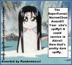 OOOO HE'S SO CUTE!!!! I love it!!(and you would too if you could actually see it...) Teehee that's why I made the Big Huge Award For Sites That Could Survive In Akira have that image!!! Soooooo it's been dubbed The Super-Kawaii Marron-Chan Award! It's for all the sites I/We see that are just awsome/off da hook/super spiffy/nifty/just really really cool and that stand above the Chicken award. This award can only be given out when one of us stumbles apon a wup-@$$ site all on our own. I know it looks reeaaaaaaaaally cheezey, but it has Marron-chan on it, so you're cool. And besides, if you have an off 'da hook site already, you could use a lil cheeziness on your site, ne? ^_^