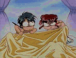 Tamahome and Miaka fight over the covers