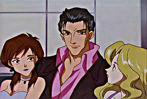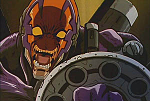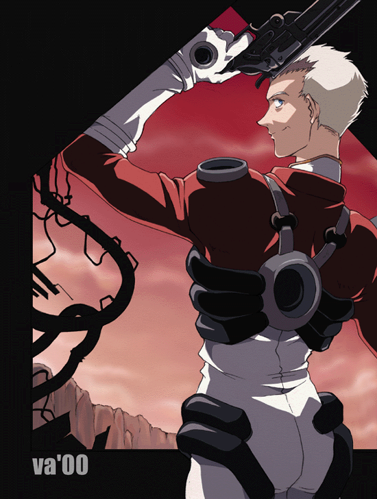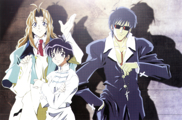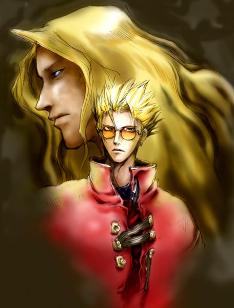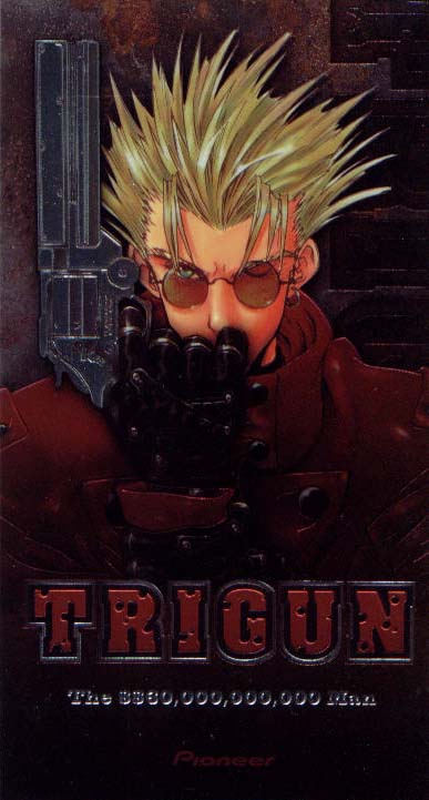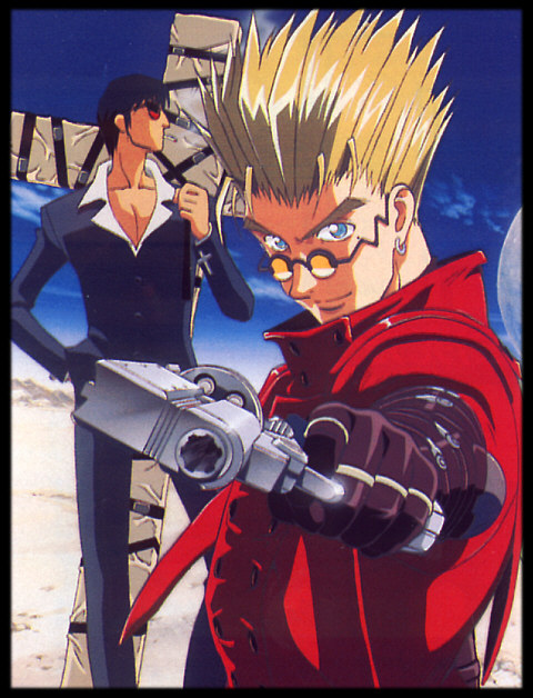 Set in the future, Trigun takes the typical "Old West" type drama, and completely warps it. (This seems to be a common thread with anime...the warping thing anyway...) The main character, Vash the Stampede, is a legendary outlaw with $$60 billion on his head in bounty money. Trouble seems to follow this guy no matter where he is or what he's doing. In an effort to minimize the risk that the Humanoid Typhoon imposes, two agents from the Bernadelli Insurance Society are sent to keep him on 24 hour surveilance. Their names you ask? Meryl Strife and Milly Thompson. A little later in the series Vash makes a friend of a wandering preist he found in the desert. This sinning preist (who just happens to be a very skilled gunman) calls himself Nicholas D. Wolfwood. Vash spends most of the series fighting his twin brother's henchmen, the Gung-Ho Guns, that want to kill him. That would be Millions Knives for those of you who don't know. Millions has a right hand man (who's very sexy!-ed.) (shut up you) (no!-ed.) named Legato. That's all I'm gonna say cause if I say more then I'm gonna give away spoilers. However, if you want to know spoilers for any show, email me and let me know and I'll make a Page-O-Spoilers.