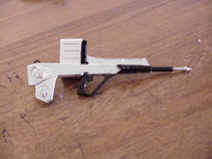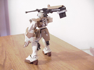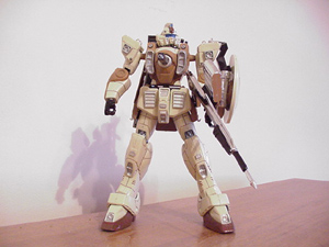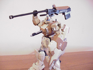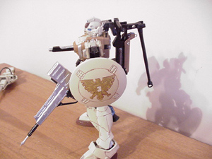My second modified mobile suit from wing. It's probably my best one yet. The hard part of it was making the cannon on the back, it resembles the folding grenade launcher from the psx game armored core. I had to saw off the front half of the bazooka, luckily there was a hole and peg connection in the part which made things easier. Then I connected a leg joint from v gundam kit to the piece that was there. For the second part I drilled a "path" from one point to another, which didn't come out very strait, then I put a bolt and nut in there and connected the other end of the leg joint to it. For the head I cut away some plastic and put putty over it to make it look like viser on a gms head. I gave it two optional shields, one with two missiles and one with a beam saber at the end of it. On other stuff like the beam rifle it has I took an extra eva rifle and added stuff to it. The shoulders and flaps are extra parts from the mg gundam.