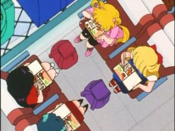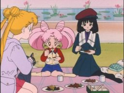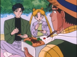 Usagi, Mamoru, Chibiusa, Hotaru, and some gardener guy having lunch. I see a bento with sandwiches at the bottom of this picture!
