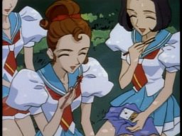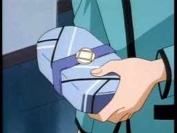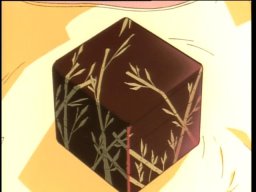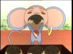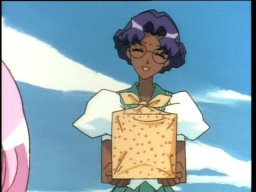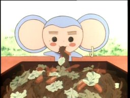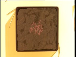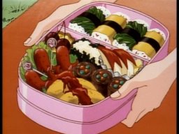 Anthy's impressive lunch for Utena. First layer, "takoyaki" (octopus dumplings), second layer "yakisoba" (fried flour noodles). And Chu Chu enjoying it.