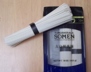Somen is made with wheat flour and are thin and white. They can be served warm in soup or cold with dipping sauce.