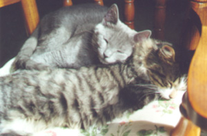 Chester is the sweet lug! He was dropped off at the shelter just the day before we adopted him. I don't think he was treated too kindly in his previous home as he was very nervous and seemed to be afraid of everything. It took some work and extra attention, but he's much better now. He's a little chubby and not quite as daring as Lily. One of his favorite things to do is to give Lily baths. (She only tolerates them for a few minutes, then she bites him!) He is a patient and quiet kitty (he didn't even meow until about a week ago!) Chester is destined to be a great mouser and lap cat! We love him dearly!